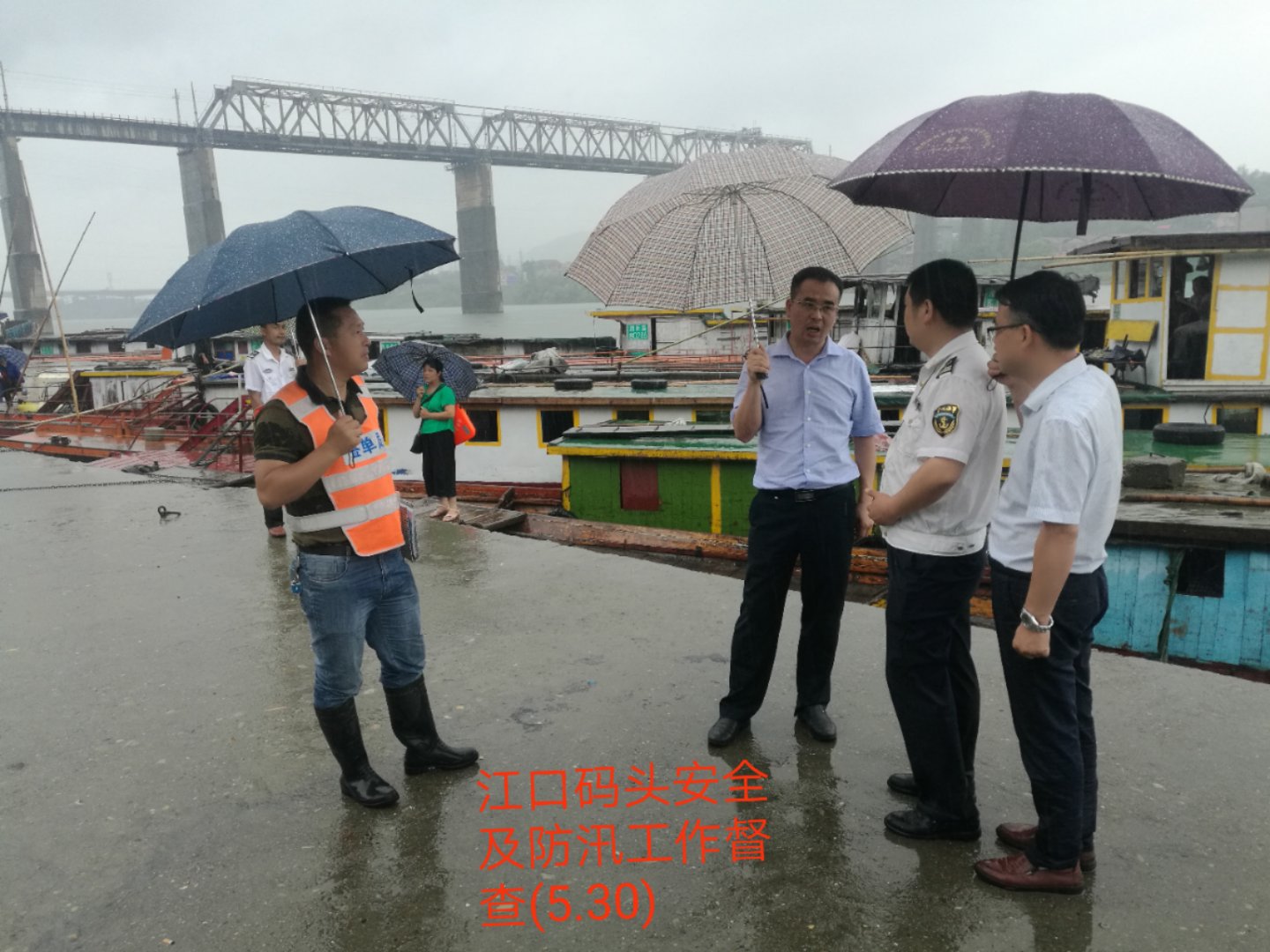 5月30日,交通运输局局长黄贤华,副局长陈刚带领安全股股长向刚、地方海事处副主任张建平来到大江口镇码头现场检查防汛度汛工作,并到县航运公司、亿达轮渡运输公司了解当前的防汛工作开展情况,现场查阅了安全生产、防汛度汛等相关资料,对存在的问题提出整改要求。